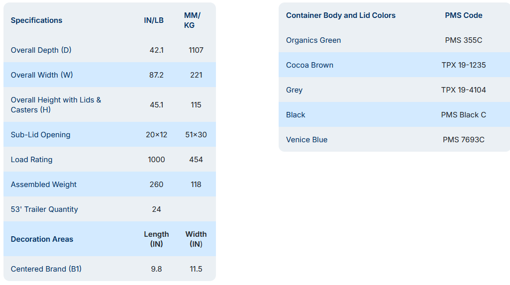 - All plastic design is lighter weight than steel container alternatives helping reduce risk of push/pull injuries