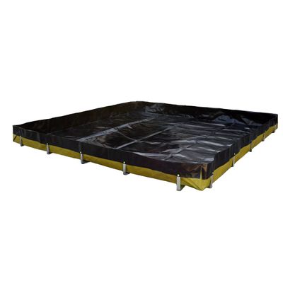 RPE Economy Berms feature an economical design that offers cost savings and secure spill containment. L-shaped aluminum brackets provide sturdy sidewall support. Easy assembly — Brackets are quickly and easily inserted into sleeves spaced around perimeter of Containment Berm. No frames, components or excess material outside of sidewalls — excellent for use as spill containment area inside of storage sheds and other buildings or structures where floor space is a premium. Economical spill containment for frac tanks and other large containers. Meets SPCC and EPA Container Storage Regulations 40 CFR 264.175. Custom sizes available.