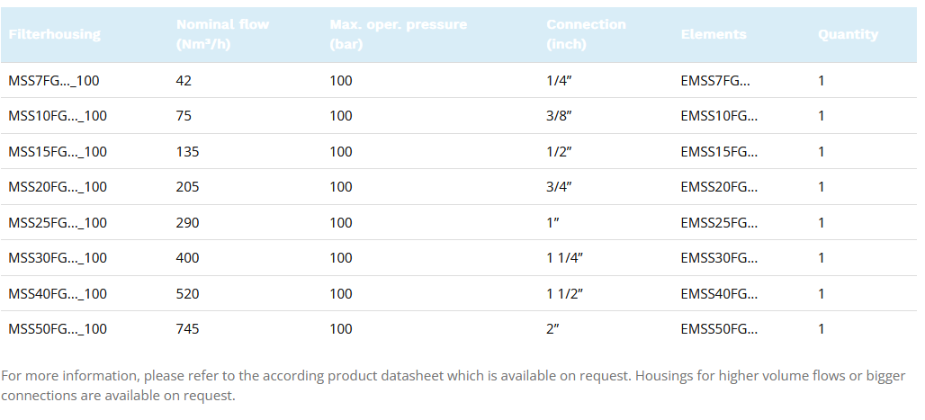 MSS filter housings have been specifically developed for highly efficient removal of solid particles, water, oil, aerosols, hydrocarbons and other vapors from compressed air systems. To meet the required compressed air quality, the appropriate filter element (FG25, FG5, FGA, FGAA, FGAC, FGWS) must be installed into the filter housings.