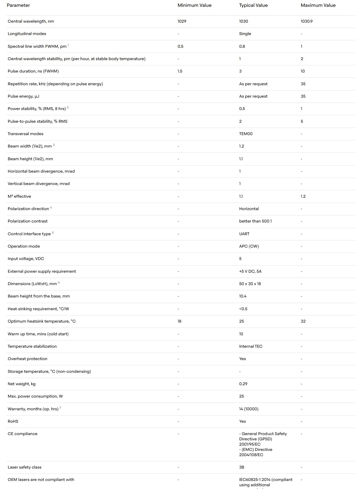 1029 nm nanosecond SLM laser module is a turnkey laser featuring single-frequency operation in a very compact package. True SLM operation (each pulse is emitted in the same longitudinal mode) ensures high pulse-to-pulse stability, low jitter, and extremely stable harmonic generation. High pulse energy and pulse-on-demand operation make this laser suitable for sorting, illumination, and pump-probe spectroscopy applications.