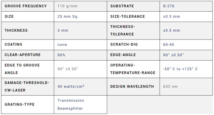 Omega Optical - 110 Groove Transmission Grating Beamsplitter, 25 mm Sq., 3 mm Thick