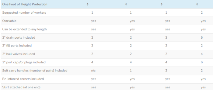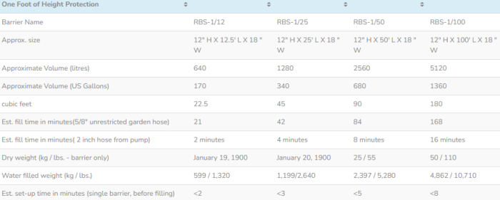 Our 12 inch high barriers are currently available in 4 lengths, 12.5 ft, 25 ft., 50 ft. and 100 ft. The shorter 12.5 ft is available in our standard weight fabric while the 3 larger lengths are available utilising our heavier weight material. All barriers feature and attached skirt at one end for attaching an additional barrier for increased barrier wall length, and all barriers have top-mounted but offset fill ports to allow the barriers to be stacked for increased height.