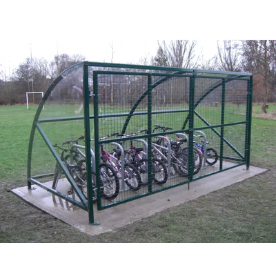 Almost always in stock (Galvanised finish), this 12 bike cycle shelter makes the most of your space. Fitting in a 4.1x2.1m area. It comes with all-round features to suit any environment and is also used and approved by Transport for London. Mild steel cycle shelter with bolt down fixing or underground fixing available. The Bike Shelter is available in a galvanised, polyester powder coated RAL code colour finish or hot dipped galvanised and polyester powder coated RAL code colour finish. Anti-vandal clear polycarbonate UV stable roof, with optional polycarbonate sides and swing or sliding gates. Comes with optional cycle parking, galvanised bike stands for secure bike parking and to provide confidence to cyclists by allowing both the frame and wheels to be secured to the cycle stand.