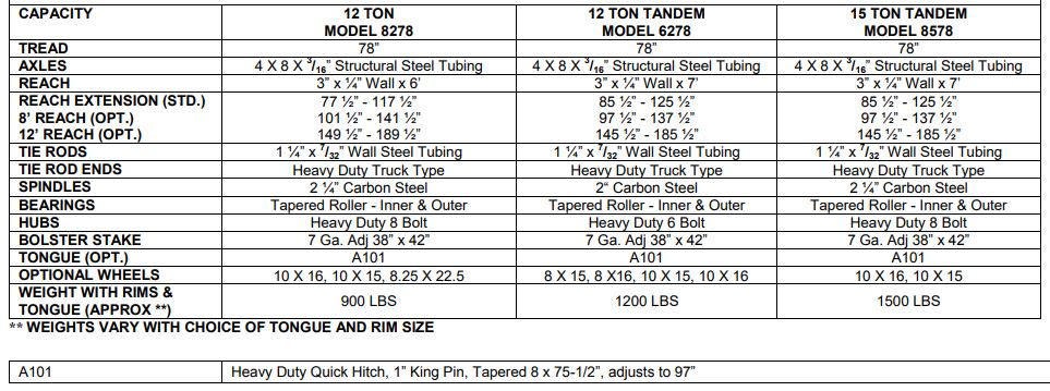 Kory Running Gear means big load hauling with rugged dependability. For years this running gear has proven itself “best in the field”. It provides maximum stability, short turning radius, auto type steering and heavy duty tapered roller bearings. Unique Kory tow-bar is adjustable to a variety of lengths. Strong box girder design and heavy duty reach braces provide excellent strength for big loads. All are designed for non-highway use at tractor speeds.