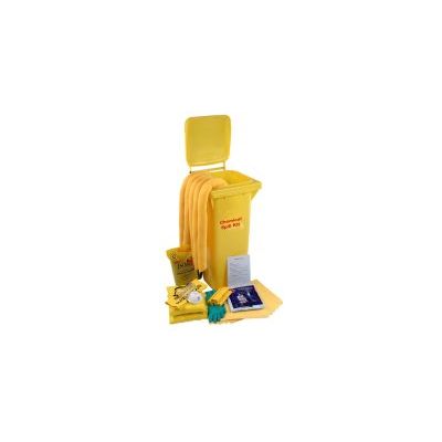 Chemical Spill Kit designated as yellow in colour, designed to absorb aggressive and non-aggressive liquids such as acids, caustics, oil coolants, solvents, water and solutions. Fast acting with high absorbency rates for larger chemical spills down to bench top laboratory situations. Contents include Wheeled Bin Yellow, 5 Socks, 50 Pads, 3 Disposal Bag, 2 Cushions, 1 Caution Roll Tape and 1 Instructions & Contents Card. Refill Kit available also.