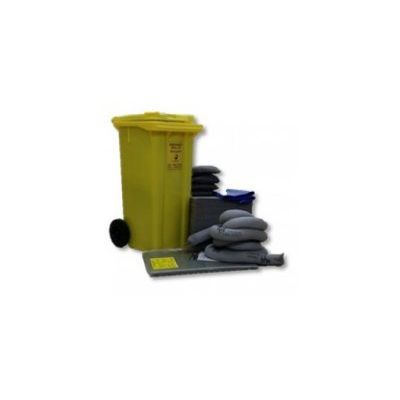 Maintenance Spill Kit designated as grey in colour, designed to absorb solvents, coolants, oils, fuels, mild acids and alkalis as well as water. Contents include Wheeled Bin Yellow, 5 Socks, 50 Pads, 3 Disposal Bag, 2 Cushions, 1 Caution Roll Tape and 1 Instructions & Contents Card. Refill Kit available also.