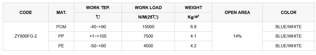 Mat.:POM/PP. Color:Blue/\vhite. Piii mat. :PP/PA. Open area: 14%. Working load: POM-15000N/M;PP-7500N/M. The belt standard width starts from 6" with 3" increments up to 120".