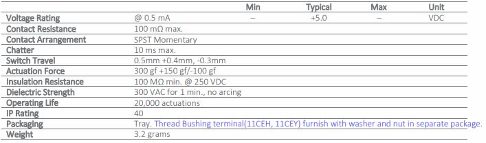 Compact 12 mm package size, Rotational life (30,000 cycles), Wide temperature range (-10°C to +70°C), Momentary switch option, Bushing and mounting style options.