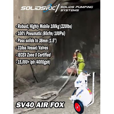 The SV40-SP Air Fox is a 50mm (2") Load & Discharge RBV Vacuum Loading Solids Pump, 105Kg (210Lb) Features a 316 SS Vessel and Valves as standard Available in 50 CFM 18" Hg or 80 CFM, and 21"Hg Vacuum