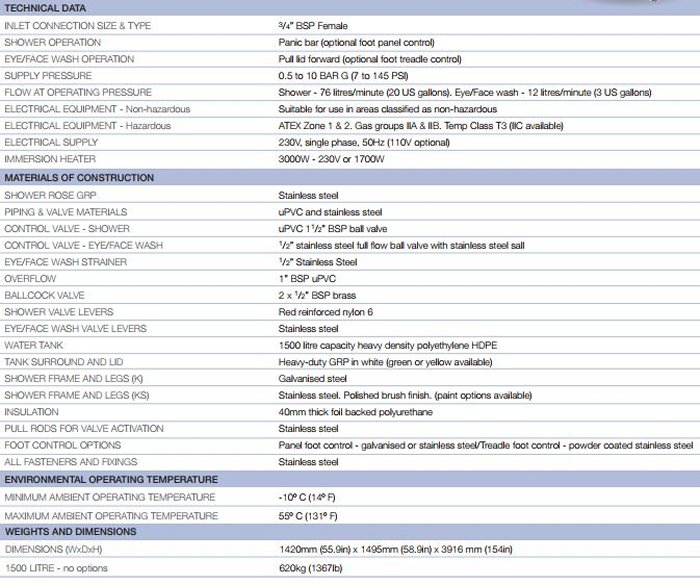 EXP-MH-14KS-1500-P: 1500 litre polar emergency tank shower with 316L stainless steel framework. Designed for severely cold climates, the polar tank shower incorporates a double-skinned fibreglass insulated cubicle to protect the user from the elements. Designed to meet and exceed ANSI standards, the shower provides tepid water for over 15 minutes at a guaranteed flow of 76 litres per minute, even when there is no mains water supply.