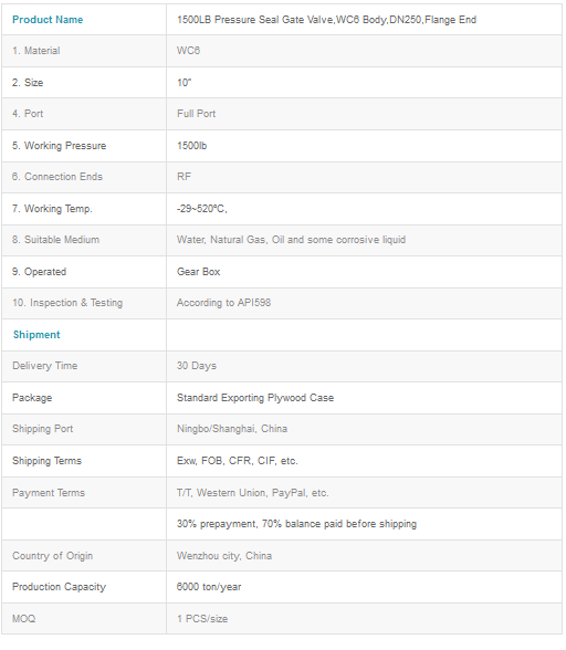 1500LB Pressure Seal Gate Valve, WC6 Body, DN250,Flange End. 1500 LB Pressure Seal Gate Valve is mainly used in the pipeline of the fire station in a variety of systems, cut off or connected piping media. Applicable medium: water, steam and other non corrosive media. Compared to the power station valves and other valve products is characterized by high temperature and high pressure, the unique self seal design, the higher the pressure, sealing more reliable. Due to the special properties of technical characteristics, conditions of formation of the products can not be replaced by other product characteristics.