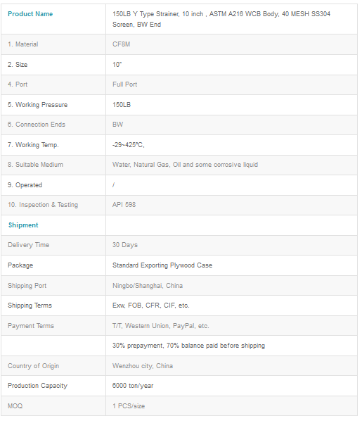Product name: 150LB Y Type Strainer, 10 inch , ASTM A216 WCB Body, 40 MESH SS304 Screen, BW End