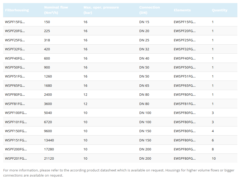 WSPF welded stainless steel filter housings, with flange connections, have been developed for filtration of compressed air as well as many other gases, where the risk for corrosion is very high or where stainless steel housing are required. To meet the required compressed air quality, the appropriate filter element (FG25, FG5, FG1W, FG1S, FG20W,FG20S, FGA, FGAA, FGAC) must be installed into the filter housing.