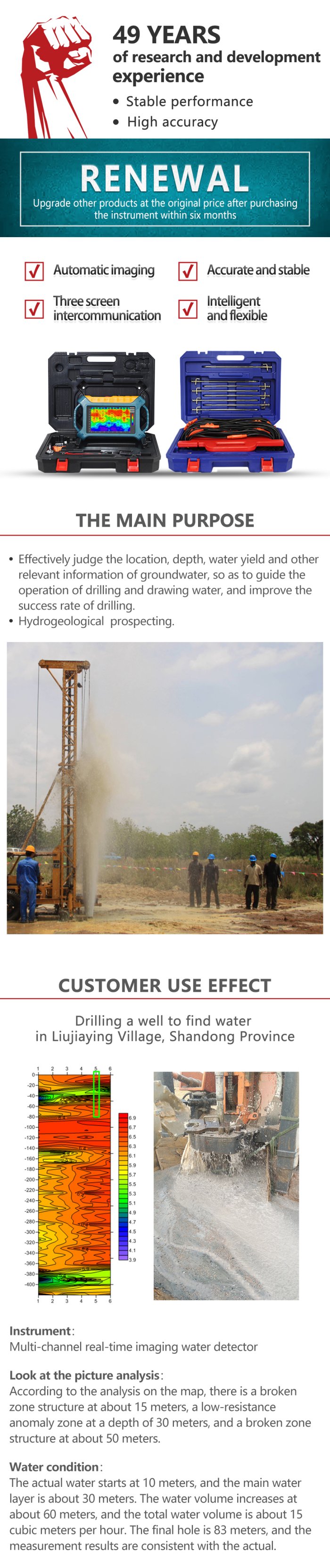 The 16-channel real-time imaging water-finder is a real-time imaging intelligent water-finder jointly developed with Guilin Institute of Hydrology and Geological Exploration. It uses 16-channel simultaneous input measurement to obtain a stable field source, which not only solves the problem of natural electric field changes at any time , And avoid the error caused by moving the electrode multiple times in the same profile, which solves the shortcoming of the repeated measurement data profile of the single-channel instrument.
