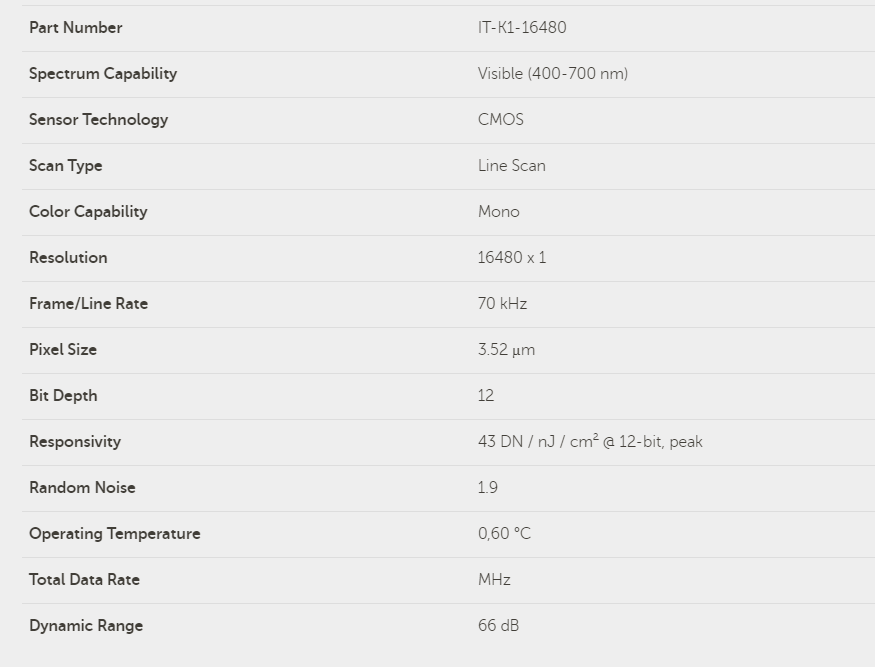 The IT-K1-16480 sensor is a high performance, digital, single line monochrome CMOS image sensor. The sensor is optimized for a high line rate and low noise, while providing high responsivity and high quantum efficiency (QE). The sensor is designed for ease-of-integration and uses FR4 packaging.