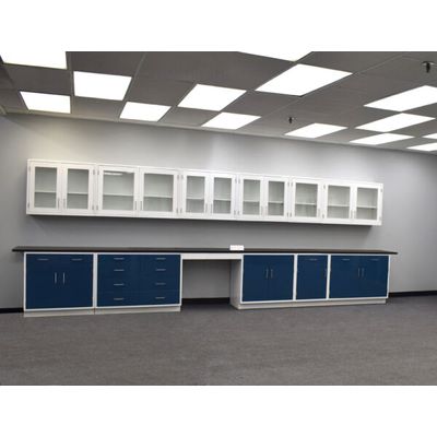 The 19-foot Fisher American Blue Laboratory Cabinets with accompanying 19-foot wall units is designed for efficient laboratory environments. This set boasts a robust structure, thanks to its fully welded design and premium stainless steel hardware, ensuring durability and longevity. The surfaces are treated with epoxy paint, offering resistance to chemicals and wear, while the sleek black countertops provide a modern aesthetic. Proudly manufactured in the USA utilizing a combination of domestic and international components, the product offers a variety of customizable options to fit diverse laboratory needs. The base cabinets come with varying configurations of drawers and doors, while the wall units feature glass doors, giving users flexibility in design. The cabinets' sizes and configurations have been optimized for laboratory use, providing ample storage and work surface area. The product also allows for the addition of sinks and faucets, broadening its applicability in laboratory settings.Most popular related searches