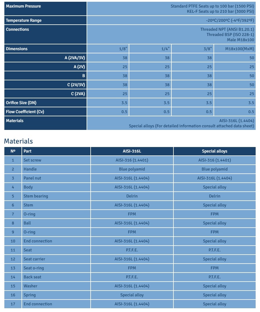 - Kel-F seats for high pressures 210bar (3000PSI).
