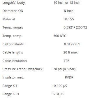 The Model 540 Conductivity Sensor offers a reliable and easy-to-use tool for measuring high-purity water or condensate return. Available configured as in-line, retractable or submersible, the Model 540 provides accurate input for monitoring or control of total dissolved solids in the 1 to 10 µS or 10 to 100 µS conductivity ranges. These sturdy sensors can withstand temperatures up to 392°F (200°C) and will serve for a long period of time.