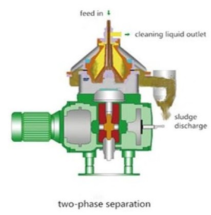 The materials are transmitted to the heart parts of disc stack separator, the inside drum. Under the action of strong centrifugal force, the materials pass through the interval of a group of disc pieces bundles, and then, regarding the neutral hole of the disk pieces as the interface, the liquid with higher density moves outward the neutral hole along the disk pieces, among which, the heavy residues accumulate in the sediment area, and the heavy phase flows to the large centripetal pump. The liquid with lower density (Light phase) moves inward and upward along the disk pieces wall and gathers in the small centripetal pump. The heavy phase and light phase output by the large centripetal pump and small centripetal pump respectively.