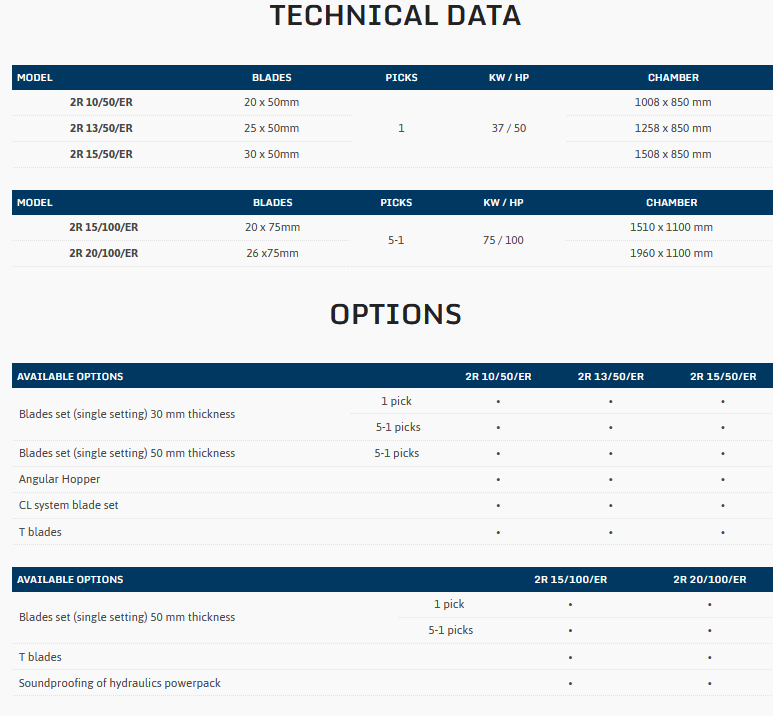 The shredders belonging to the 2R50ER and 2R100ER series represent a valid electric-driven equipment alternative to the standard hydraulic version, suitable for all those cases where there is a need of remarkable performances (respectfully up to 3 and 5 t/h) but the area where the shredder would be located is not big enough for placing also the hydraulic unit. Moreover, the shredders of this series are using a planetary gearbox for each shaft.