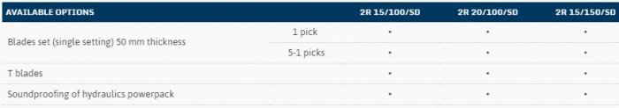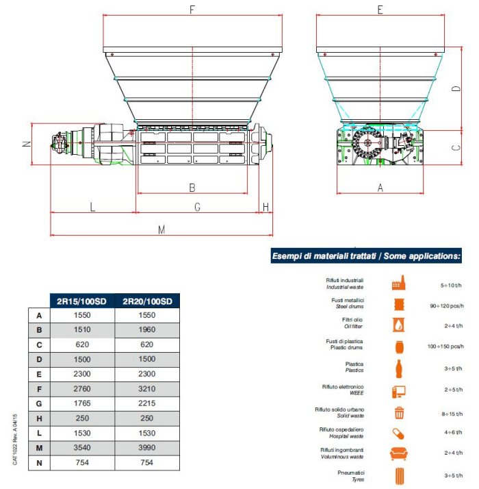 Technical data: 2R15/100SD. Shredding chamber (mm): 1510x1100. 50 mm blades (no.): 30. 75 mm blades (no.): 20. Power (kW): 75. Voltage (V): 220/400/460. Weight (kg): 9500+1620.