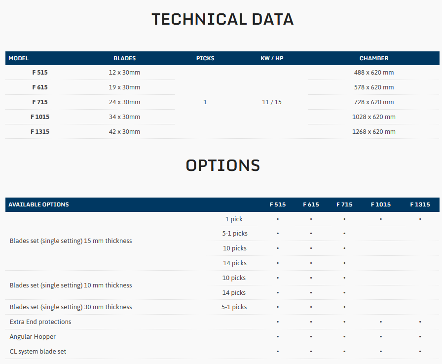 Together with the F15, this 2-shaft shredder (available in 3 versions) is one of the best seller inside the range of shredders produced by SatrindTech. The materials you can process are several, mainly in the industry for volume reduction applications: plastic (purges in PET, HDPE, PVC, PP o PC, and plastic in general, pipes and profiles, PET bottles, etc., HDPE cans and drums, automotive components in ABS, PU, PP, PE), solid/liquid separation, food waste, aluminum swarfs and cans, metal swarfs, electric cables, WEEE, confidential documents, paper, hazardous and pharmaceutical waste.