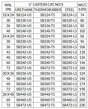 - All welded construction (except casters), with durable 12 gauge steel shelves, 3/16” thick angle corners, and 12 gauge caster mounts for long lasting use.