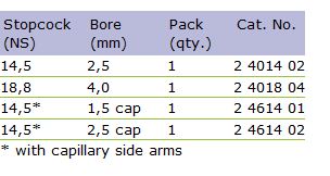 2-way stopcocks with solid glass plug With solid glass plug and screwthread retaining device, two oblique bores, material: borosilicate glass 3.3,leakage rate acc. to DIN 12540-1.