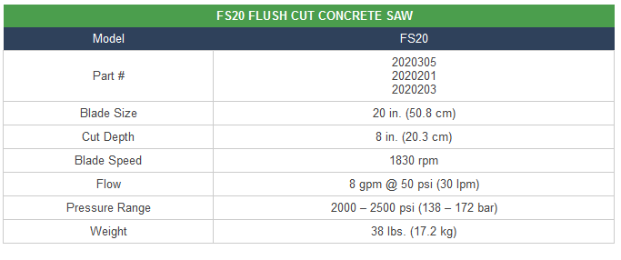- Model Description: FS20 Hand Saw, Guard and Depth Guide w/ 8 in. cutting depth. 1830 rpm @ 8 gpm, FS20 Hand Saw, Guard, Depth Guide and Upright Handle w/ 8 in. cutting depth. 1830 rpm @ 8 gpm, FS20 Upright Saw w/ 8 in. cutting depth. 1830 rpm @ 8 gpm