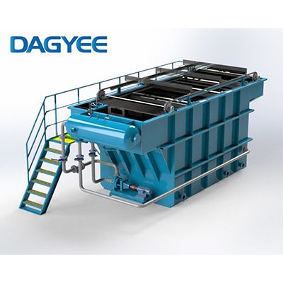 DAF dissolved air flotation consists of flotation tank, dissolved air system, reflux pipe, dissolved air released system, skimmer (Based on customer needs, there are combined type, traveling type and chain-plate type to choose.), electric cabinet and so on. Air flotation separation technology of DAGYEE DAF dissolved air flotation dissolved air into water at certain working pressure. In the process, pressurized water is saturated with dissolved air and is discharged into a flotation vessel. The microscopic air bubbles produced by released air attach to suspended solids and float them to the surface, forming a sludge blanket. A scoop removes the thickened sludge. Finally, it complete purifies the water.Dissolved Air Flotation Description