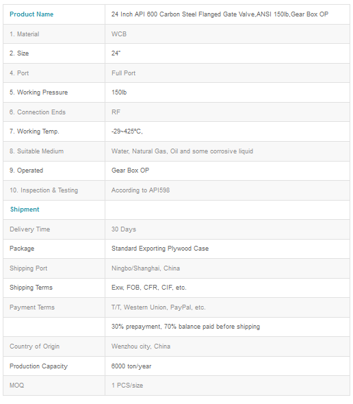 24 Inch API 600 Carbon Steel Flanged Gate Valve,ANSI 150lb, Gear Box OP. 24 Inch API 600 Carbon Steel Flanged Gate Valve that opens by lifting a round or rectangular gate/wedge out of the path of the fluid. The distinct feature of a gate valve is the sealing surfaces between the gate and seats are planar. The gate faces can form a wedge shape or they can be parallel. Typical gate valves should never be used for regulating flow, unless they are specifically designed for that purpose. On opening the gate valve, the flow path is enlarged in a highly nonlinear manner with respect to percent of opening.