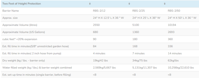 Our 24 inch high barriers are currently available in 3 lengths, 12.5 ft, 25 ft. and 50 ft. All 24 inch barriers are available utilising our heavier weight material. All barriers feature and attached skirt at one end for attaching an additional barrier for increased barrier wall length, and all barriers have top-mounted but offset fill ports to allow the barriers to be stacked for increased height.