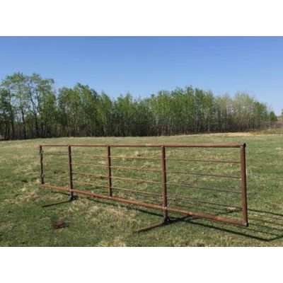 5.5’ tall and 24’ long. rectangular frame is built from 2&7/8" drill pipe. inside bars are 1” sucker rod. one end has two 34” long pieces of ¼” chain with latches. the feet are 6’ wide and each foot is braced with two 5.5” pieces of 1&1/2" angle iron. heavy duty foot design with pipe going all the way from the foot right up to the top 24 foot bar