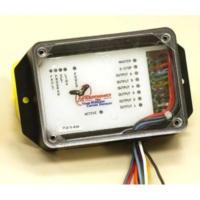 Enclosure: ABS Plastic. Color: Black. Decal: Customizable. Sealed: Potted Board. Dimensions: 5 1/2” L x 3 1/4” W x 1 1/4” D. Antenna: Internal 2.4 GHz. Weight: 8 oz. Address Code: 4.2 Billion. Operating Temp: -20c to +50c. Range: 300 ft. Frequency: 2.4 GHz DSSS. Power Source: 10-30 Volts. Current Draw: Max 5 Amps. Output Controls: 1-6 with Emergency Stop Switch and Master. Standard Features: 24″ Wire. Options: Customizable Wire Length.