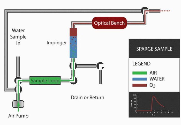 - Measurement Principle (Absolute Method): Integrated UV Absorbance of Ozone Sparged from ~2 mL of Water Sample