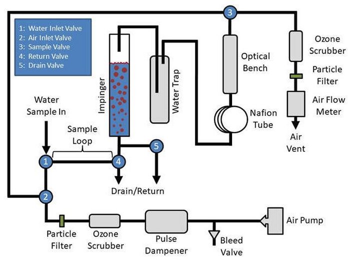 The schematic diagram below shows additional components necessary to the operation of the instrument. These include a bleed valve to adjust the air flow rate, pulse dampener to reduce air flow fluctuations, ozone scrubbers to remove ozone from ambient air used to sparge the sample and to scrub ozone from vented air, air particle filter, water trap to protect the optical bench from exposure to liquid water, Nafion tube to equilibrate humidity with ambient air, and an air flow meter.