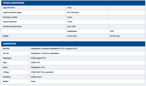 Air Inlet: 1/8" FNPT. Liquid Inlet: 3/8". Liquid Discharge: 3/8". Connection Type: NPT (Threaded). Max Suction Lift Capability: 3.3 ft-H2O (1 m-H2O) Dry, 29.5 ft-H2O (9 m-H2O) Wet.