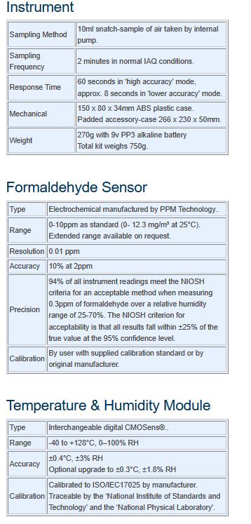 - Displays formaldehyde concentration in both parts per million (ppm) and mg/m³.