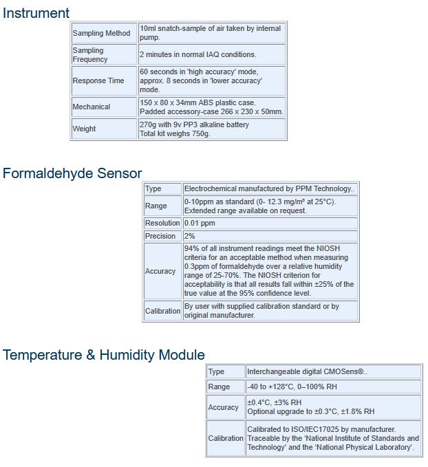 • Displays formaldehyde concentration in both parts per million (ppm) and mg/m³.