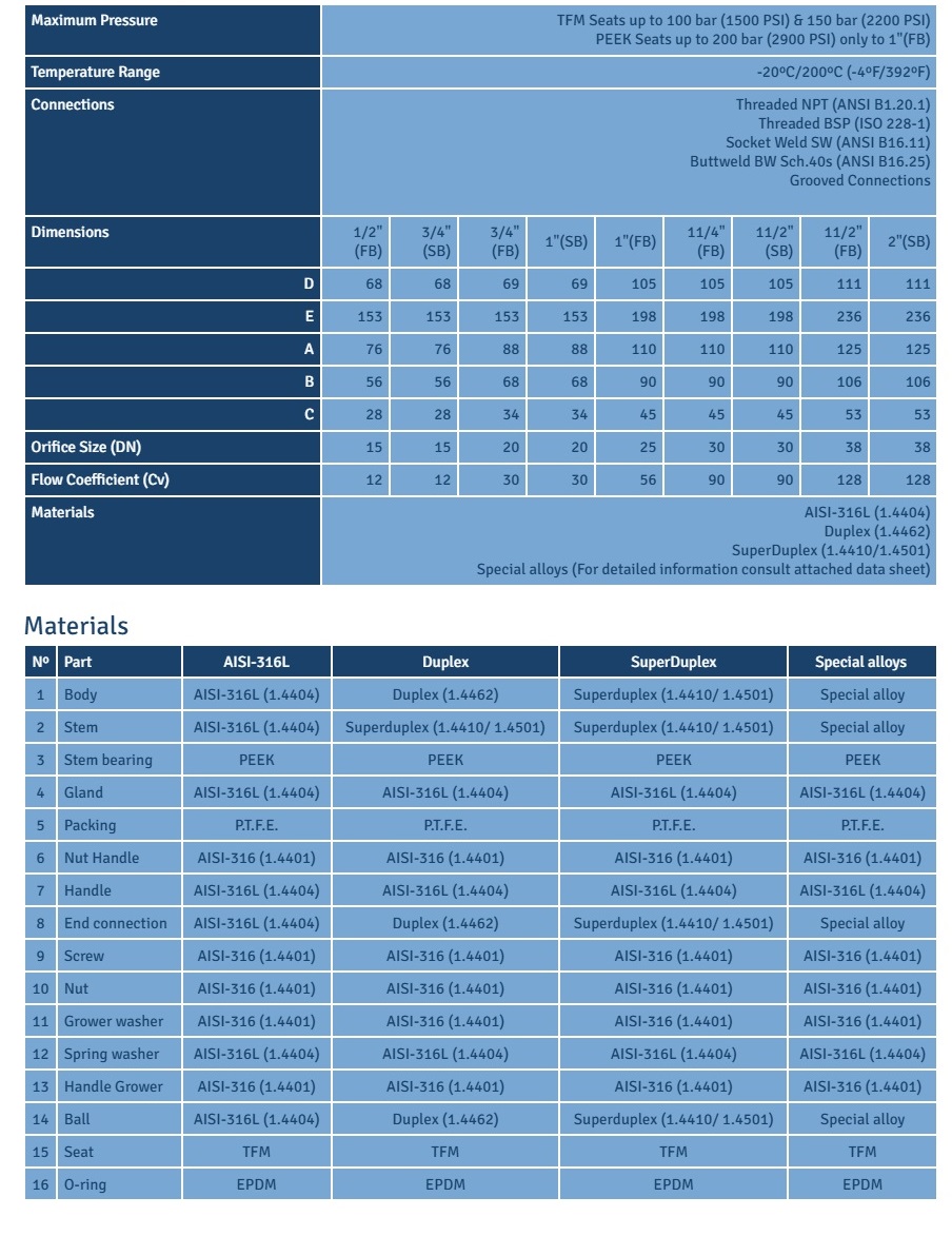 - PEEK seats for high pressures 200bar (2900PSI).