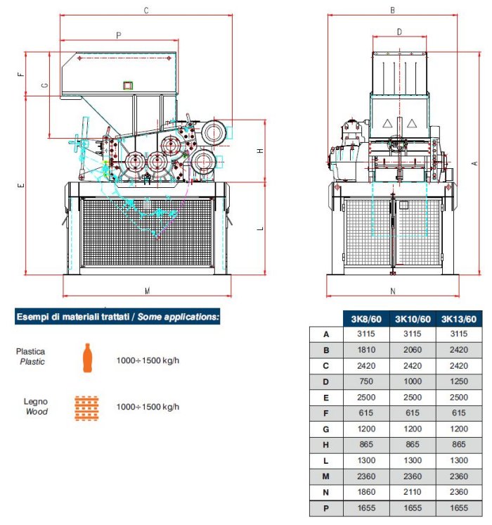 Technical data: 3K8/60. Shredding chamber (mm): 750x760. 30 mm blades (no.): 37. 50 mm blades (no.): 22. Power (kW): 44. Voltage (V): 220/400/460. Weight (kg): 6700.