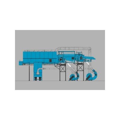 To create a suction flow above the separation drum, both the expansion rooms are executed with 2 extraction ducts which are, by means of two suction ducts connected to two fan separators (nr 5 and nr 11). One fan for each separator. The fans extract for 100% the air out of the two expansion rooms. In the fans the air is separated in an air dust flow of approx. ± 20%, and a blow air flow of ± 80%.