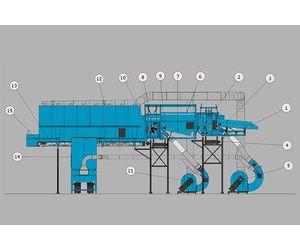The light fraction is separated in the separation room and blown and extracted over the drum and discharged in the second expansion room (nr 12).