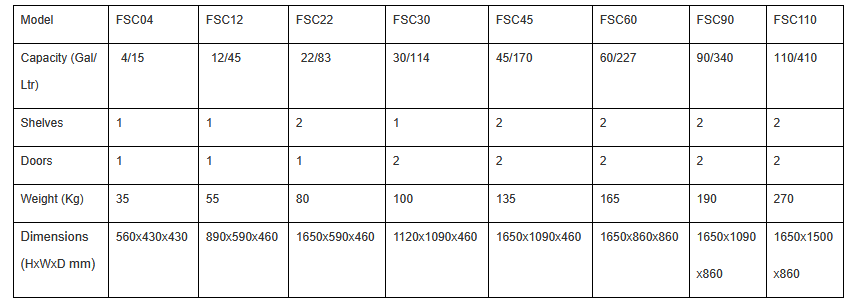 Constructed of sturdy 18-gauge (1mm) CRS steel, with 1-1/2” (38-mm) of insulating air space for fire resistance. Galvanized steel shelves direct spills to back and bottom of a leak-proof 51mm sump. Durable lead-free epoxy/polyester powder-coat finish provides excellent chemical resistance capacity. 3-point stainless steel bullet latching system makes it work safely.
