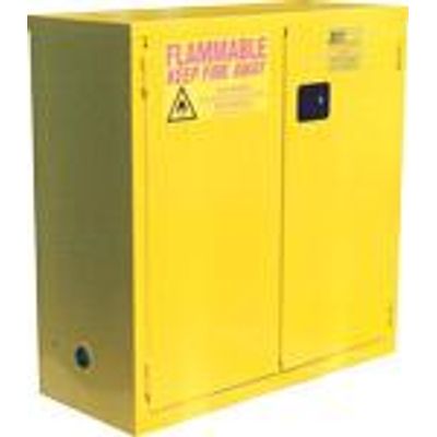 Premium features standard on the Jamco Flammable Safety Cabinet include: All welded double wall 18 gauge construction with 1-1/2” insulating air space, 2` leakproof sill to contain leaks, Lockable flush mounted handle (gripper pad) with 2 keys, Doors have 3 point locking system and radius edges, Doors are double walled, 14 gauge outside & 18 gauge inside, 4` heavy duty welded hinges with brass pins, Twin 2” flame arrester vents, Adjustable leveling feet, Powder coated yellow finish (see options), Safety signage in large red letters, Galvanized steel shelves adjust on 2-1/2” centers, Grounding connector, Meets OSHA and NFPA code 30 & UFC 79 standards, Manual close doors (open to full 180°), Flammable Safety Cabinet max storage - Class I & II - 60 gallons, Class III - 120 gallons