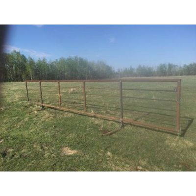 5.5’ tall and 30’ long. rectangular frame is built from 2&7/8" drill pipe. inside bars are 1” sucker rod. one end has two 34” long pieces of ¼” chain with latches. the feet are 6’ wide and each foot is braced with two 5.5” pieces of 1&1/2" angle iron. heavy duty foot design with pipe going all the way from the foot right up to the top 30 foot bar