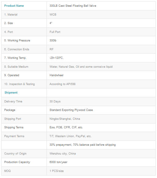 Our 300LB Cast Steel Floating Ball Valve With ANSI 300# full bore 2 piece Ball Valve. A WCB body and stainless steel 316 ball, with RPTFE seats for High Temperatures. Principle of the cast steel floating ball valve: This kind of ball valve has a floating ball supported by two valve seats. Under the medium pressure effect, a certain displacement can be generated by the ball itself so as to be pressed onto the seat seal ring at the outlet, guaranteeing tightness at the outlet. floating ball valve is mainly used in middle or low pressure application.