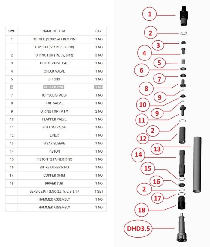 3.5″ DTH Hammer, with Top connection Threads 2 3/8″ API-IF PIN, Shank Type – DHD 3.5 . SUITABLE BUTTON BITS : Flat face(Optional – Concave Face). Dia – 3 1/2″(89 mm). Dia – 4″(102 mm).