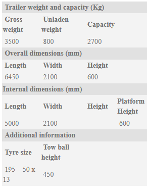 Standard equipment includes two 8′ loading ramps, a 2000 kg hand winch, spare wheel and rear loading stands as shown in the above photo. As an option the body width can be increased to 2.3 metres. A third ramp can be fitted in standard width trailers or four in wider models. Front slide in, bridging ramps and a fold over jockey wheel are also available as options for loading over on to the towing vehicle. We now can offer, also, model 356B with the body length increased to 18′, the longest beaver trailer available.