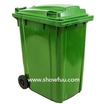 item No.:SFGB-360. Description: 360-Litre Wheelie Bin {Flat Lid). Capacity: 360 litre. Weight: about 15.3 kgs. Maximum allowable weight: 160 kgs. Material: Injection moulded, high-density polyethylene (HDPE) UV stabilized. Wheels: Two wheels, and corrosion resistant steel shaft. Lid-body attachment: Two plastic pivots. Certification: pending verification of EN 840-1, 5 and 6 standard. Origin: all manufacture in Taiwan. Colours: Green, Red, Blue, Yellow, Black, Gray.